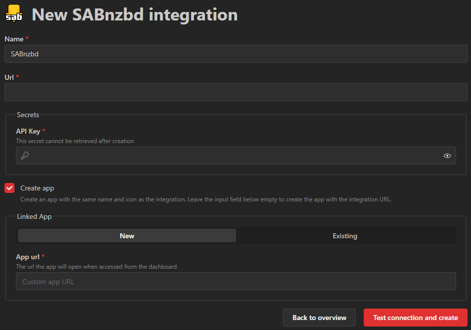 During the creation of an integration you can choose to add / link an application to the integration. If you want to add one, you can simply specify the app url which will be used for opening the application from Homarr. The linked application will also be used for any links the integration widget contains. If you already have an application created, you can also link it to the integration by selecting it from the dropdown. On the edit page you can always change or remove the linked application.